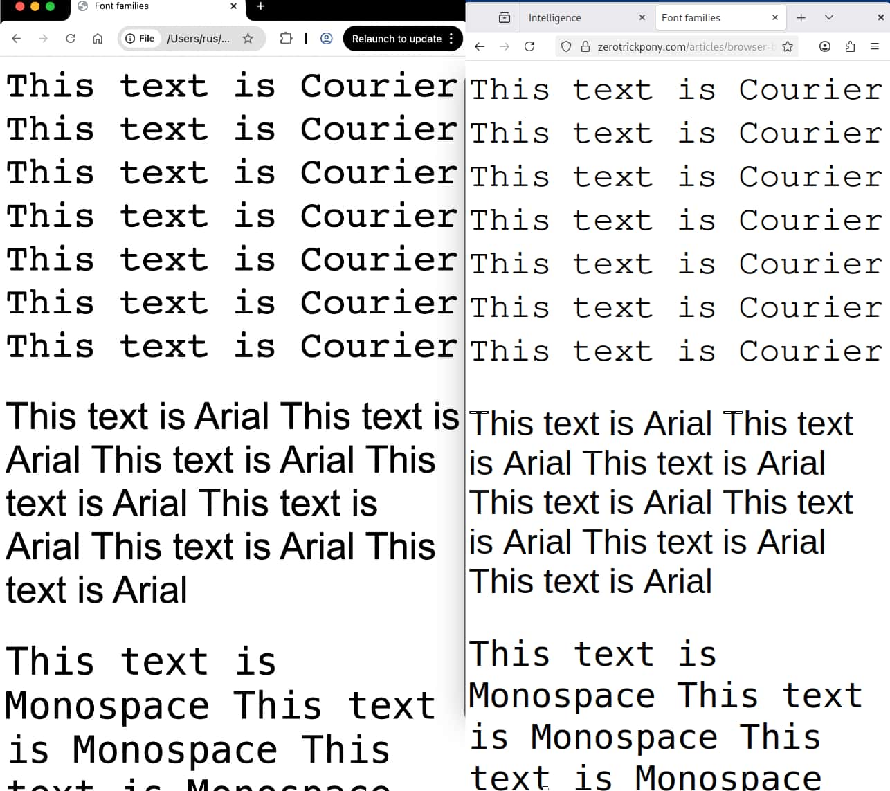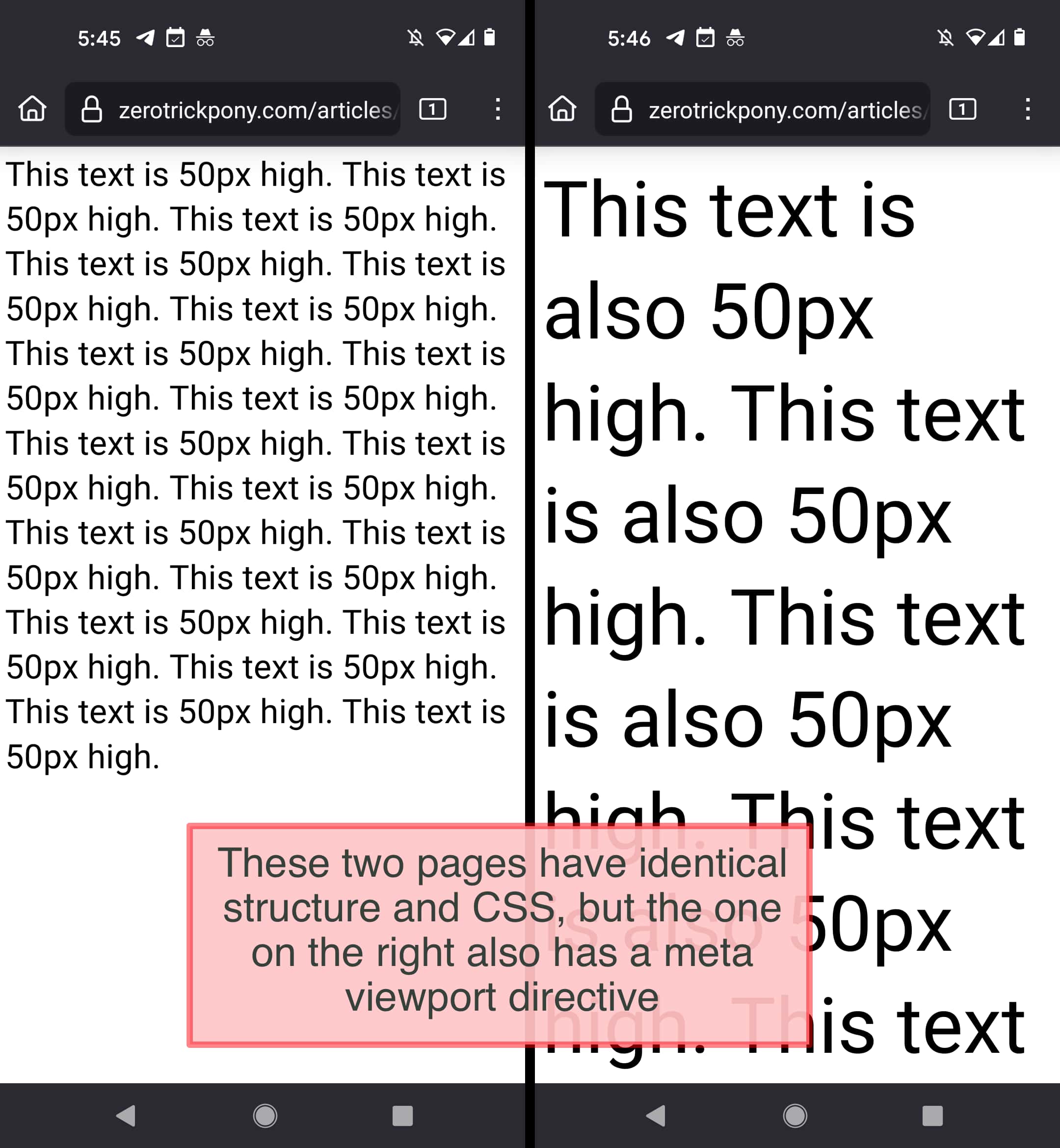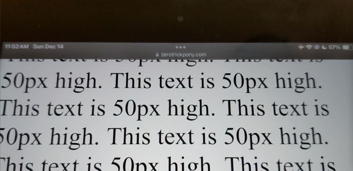 Broken CSS units: Experienced web developers have tried complicated tricks to work around this resizing behavior. Later, new units were introduced to CSS to try to give the web page more control over this. And although newer Safari iOS versions support them, Firefox iOS still doesn't. [#2]